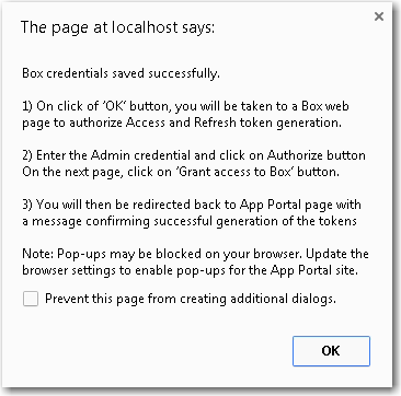 5. Click Save and Generate Access Token . A message box opens stating that the cloud application vendor credentials were saved successfully, and prompting you to perform additional tasks to generate a token.