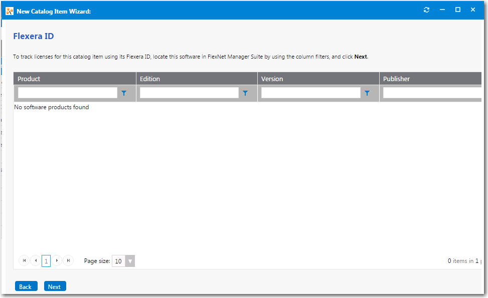 4. When you are finished editing the fields on the Catalog Item Title and Category panel, click Next . If you are connected to FlexNet Manager Suite via the Flexera Service Gateway, the Flexera ID panel opens.