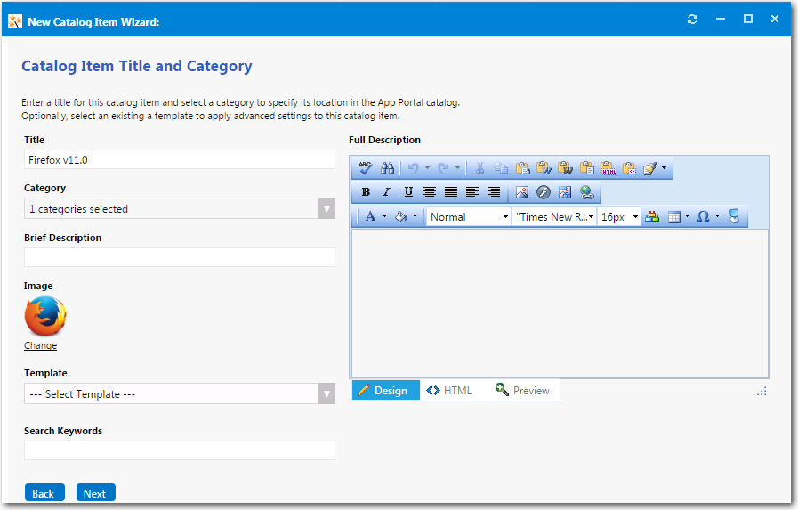 • Title—The text entered in the Title field along with the catalog item icon, will be displayed when viewing this catalog item on the Browse Catalog tab.