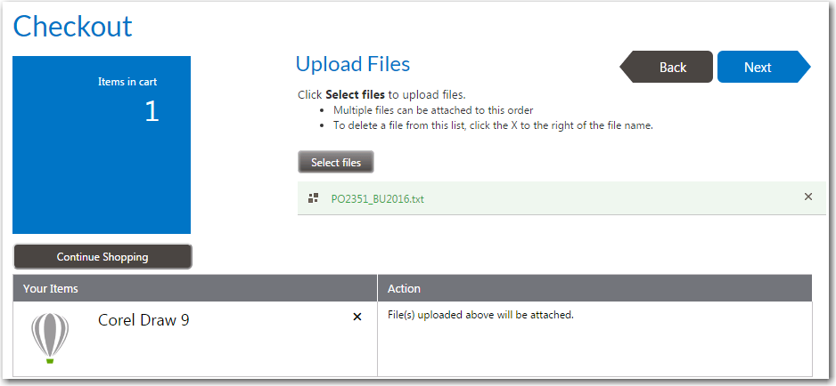 You can choose to prompt the requester to upload a file to a request during the checkout of a catalog item, perhaps to associate a purchase order or other file associated with your organization’s business practices. If the Allow File Upload? option on the catalog item’s Catalog Item Properties dialog box is selected, the Upload Files panel of the Checkout wizard will open, prompting the user to upload one or multiple files.