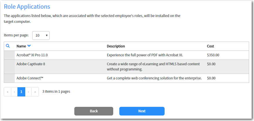 5. From the Task sequence list, select the task sequence corresponding to the action you want to take, and then click Next . The Role Applications panel opens, listing the applications that are associated with the selected employee’s roles, which will be installed on the target computer.