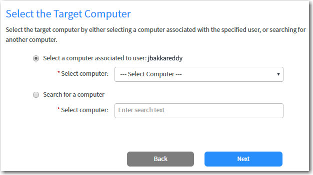 • To select one of the computers associated with the specified user to update, select the Select a computer associated to use: USERNAME , and select a computer name from the Select computer list.