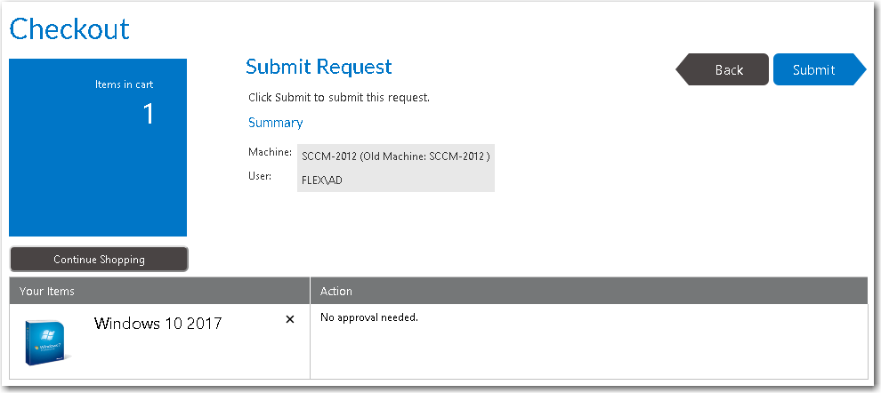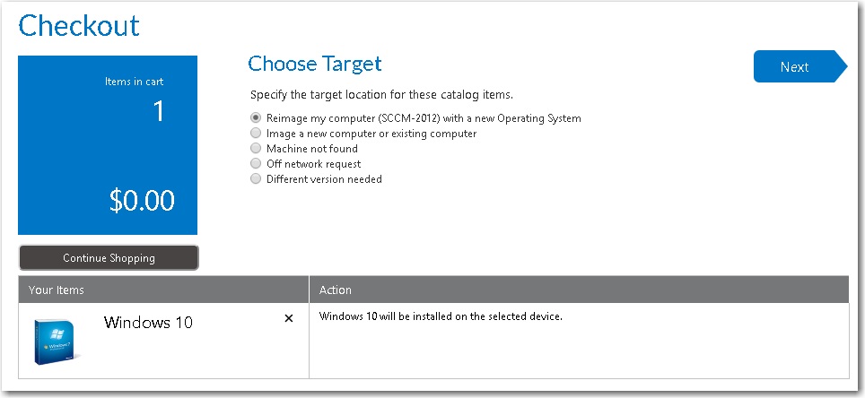 - On the Browse Catalog tab, locate an OS deployment task sequence catalog item, and click Add to add it to your cart. The Choose Target panel of the Checkout Wizard opens.