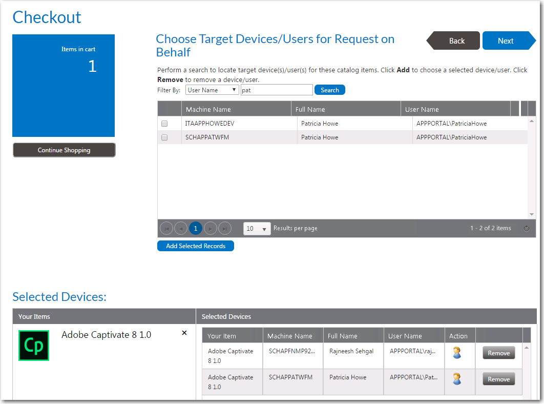 - On the Choose Target panel of the Checkout Wizard, select People who report to me , as described in Choosing a Target or Target Option, and click Next . The Choose Target /Users for Request On Behalf Panel panel opens, listing only those users who report to you.