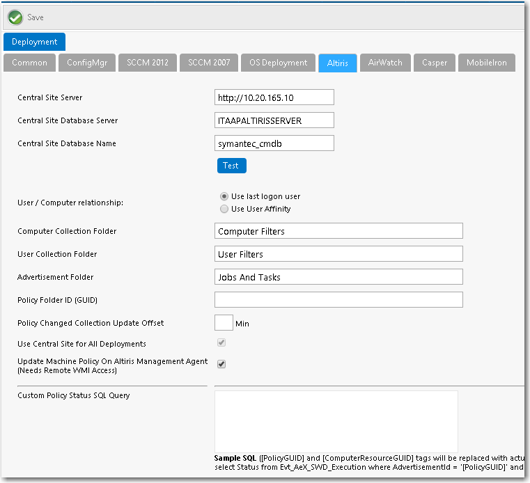 - In the Central Site Database Name , enter the database name of the Altiris Notification Server database.