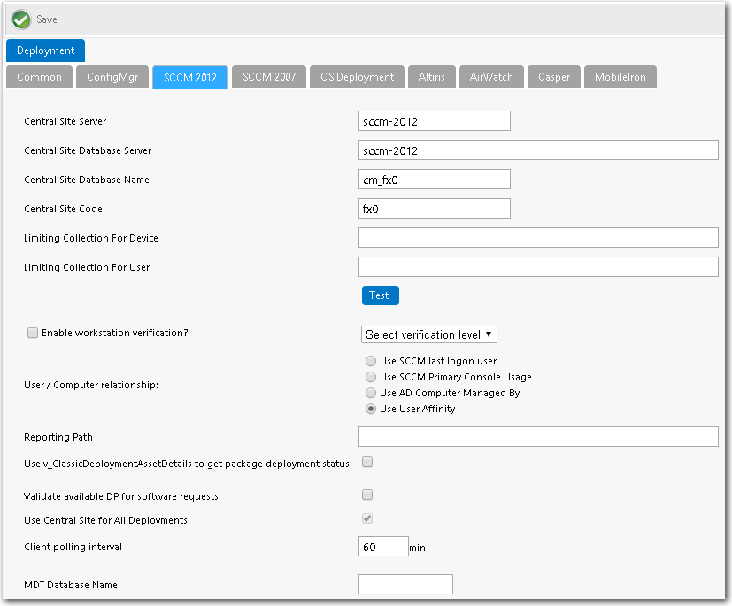 To enter System Center 2012 Configuration Manager connection settings, perform the following steps:
