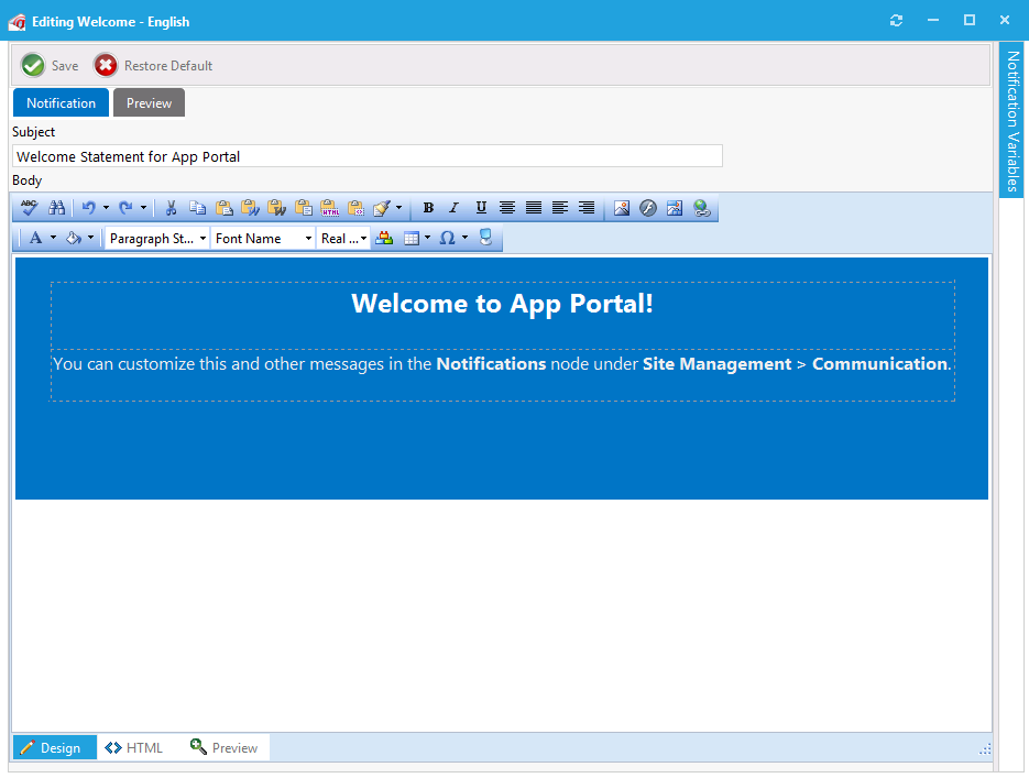 2. Under Site Management , select Communication > Notifications . The Notifications View opens.